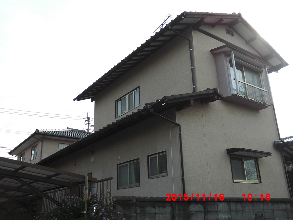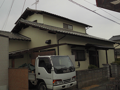 塗装前の写真です。築50年で初めての塗装です。壁のひび割れや色あせが多い状態でした。