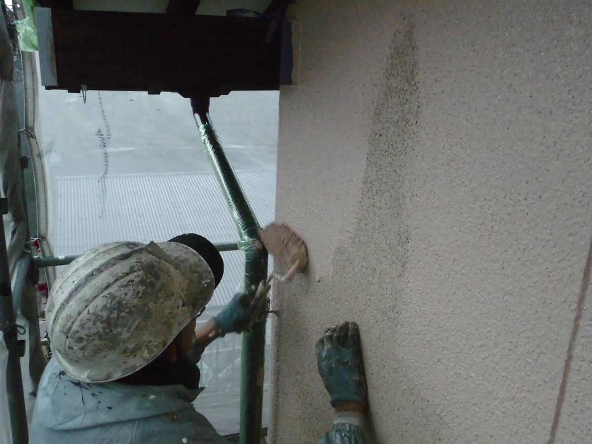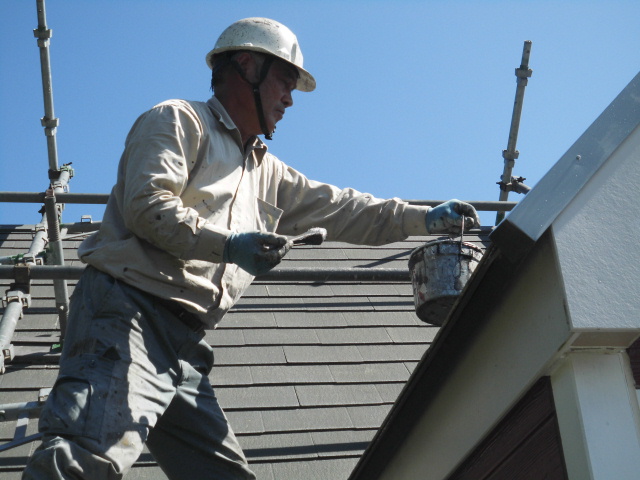 写真は上塗りを終えた写真です。熟練職人さんがローラー、ハケを使って、弱溶剤2液形フッ素塗料を丁寧に塗っています。