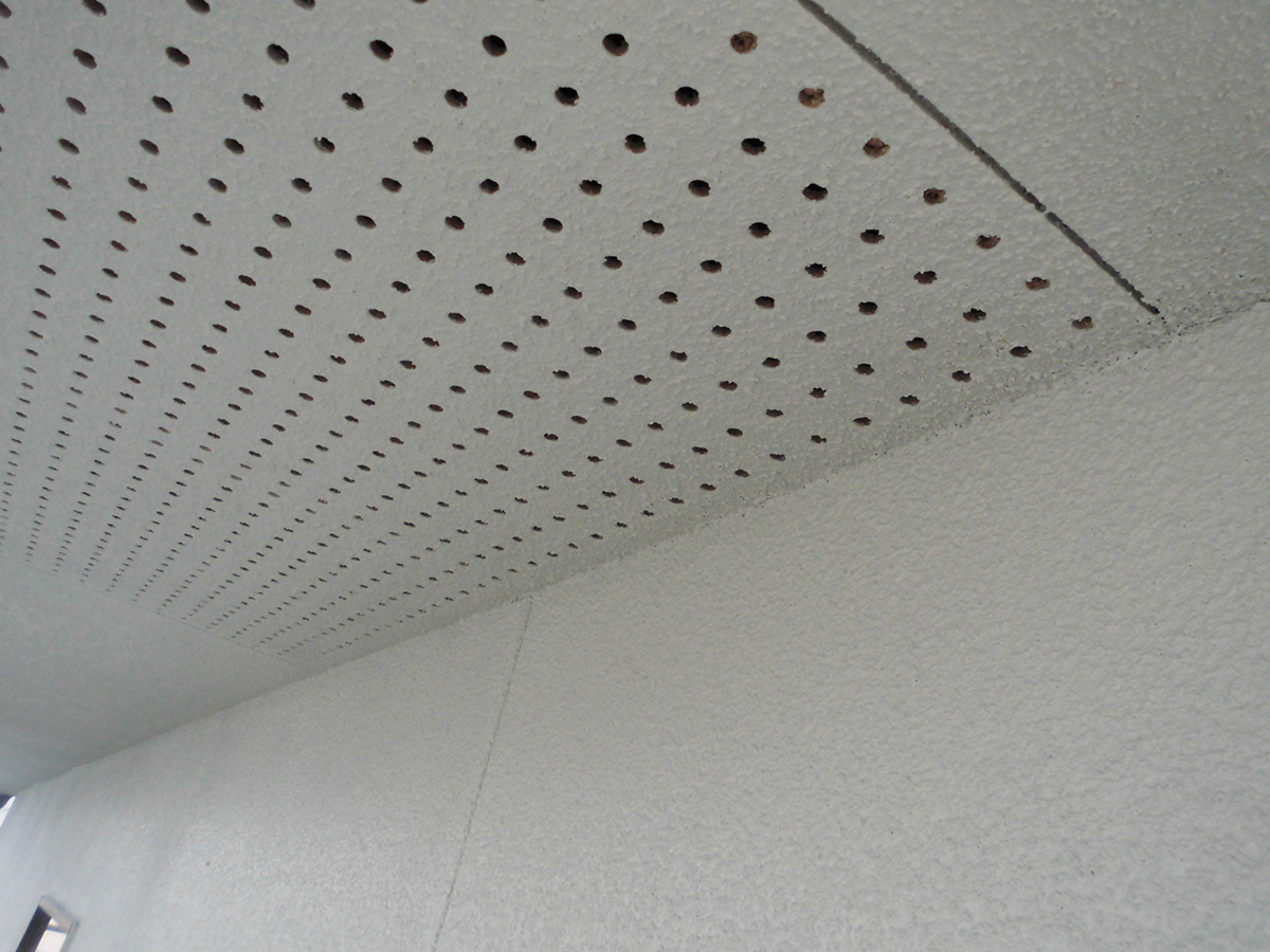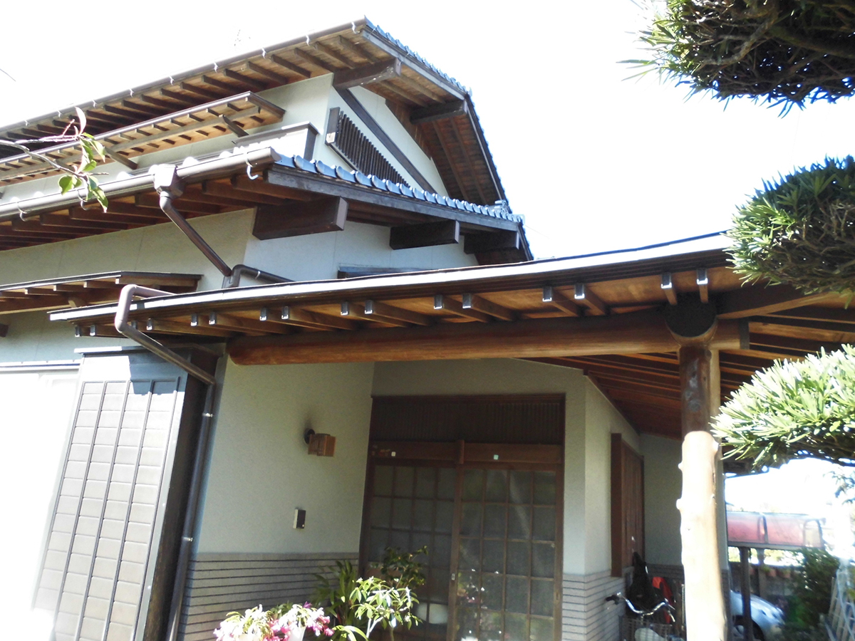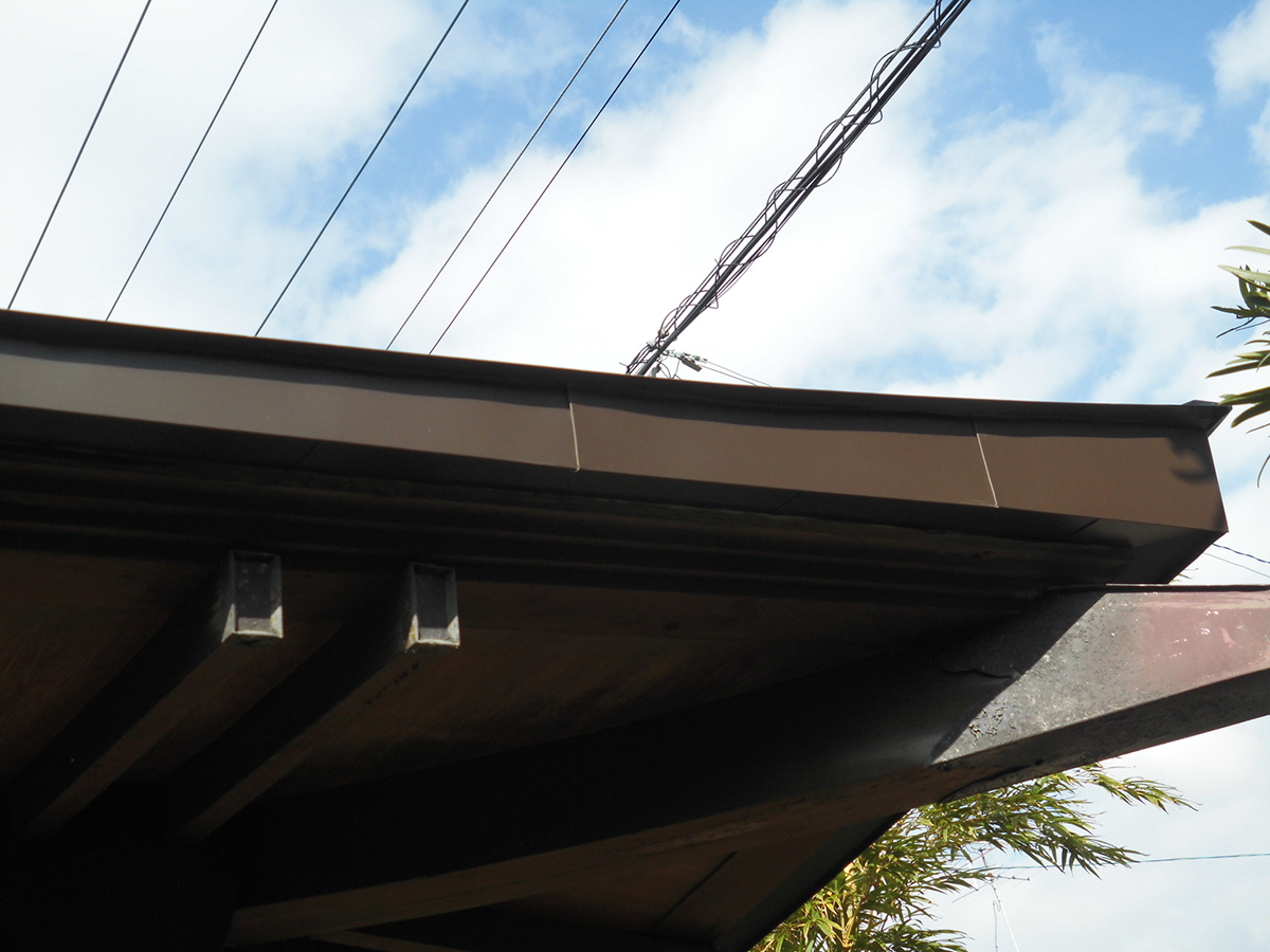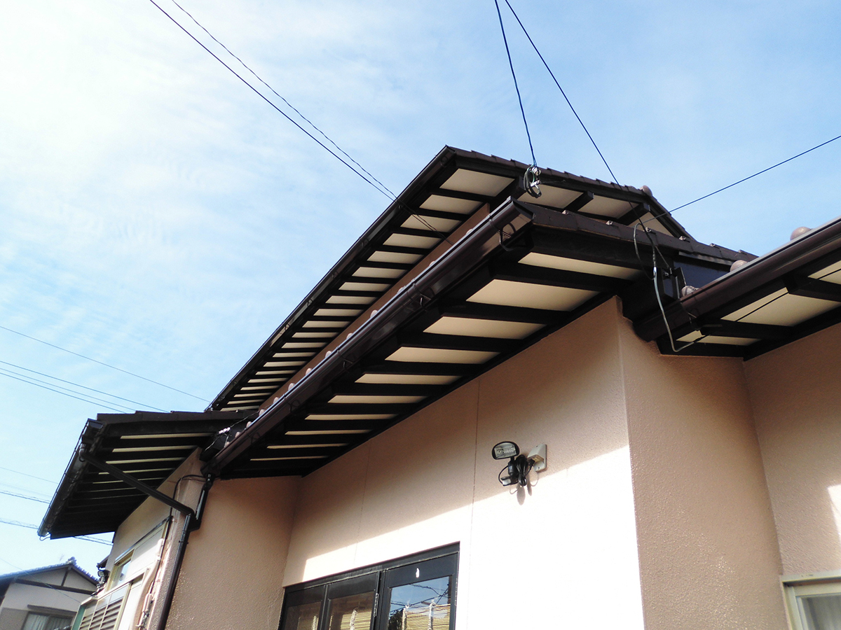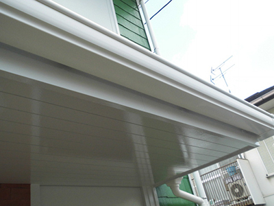 軒下のケイカル板塗装は、長期メンテナンスサイクルを考えて超耐久性、セラミックシリコン樹脂塗料を塗装しました。今回は、外壁と同色にしてゴタゴタせず、スッキリまとめました。