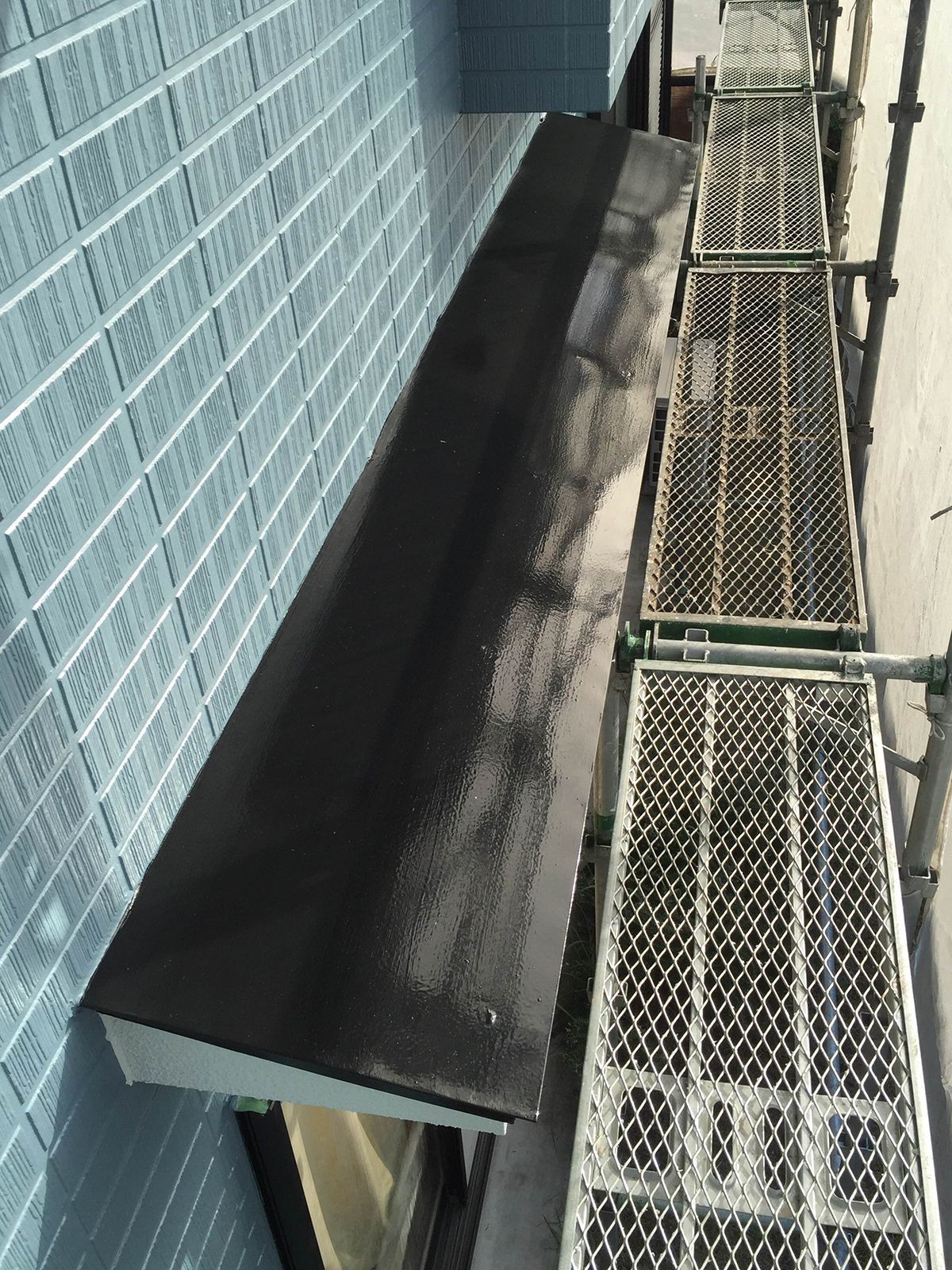 雨戸の塗装が終了。雨戸も鉄部なのでサビ落しをした後、錆止めを入れ弱溶剤2液形シリコン塗料を2回に分けて塗りました。