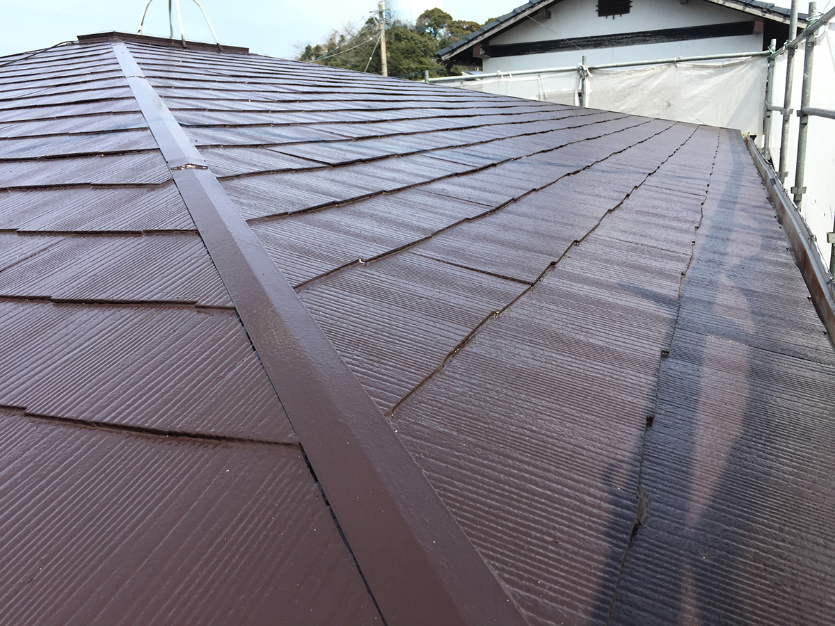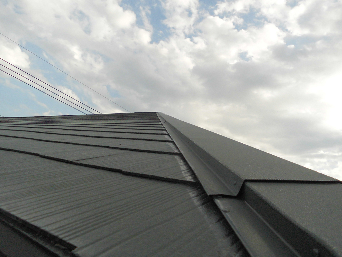 コロニアル屋根の塗装完了です。下塗りの後、弱溶剤2液形シリコンで塗装。耐候性があり、水性塗料とは仕上がり・寿命の差が出ます。