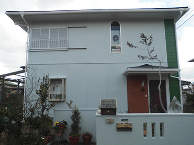 上塗りを終えて完成です。外壁がモルタルなので、ひび割れ対策のためにゴムのように弾力のある弾性塗料を使用しました。