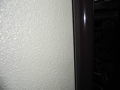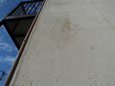 塗料が完全にはがれて、モルタル壁素地そのものになっています。雨水が浸透しやすく、コケ・力ビが生えやすい状態です。