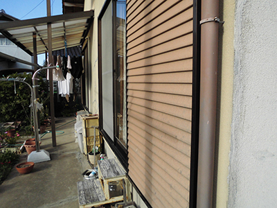 塗装前の写真です。外壁に色あせ・雨戸にサビが多く見られます。生まれ変わらせて頂きます。