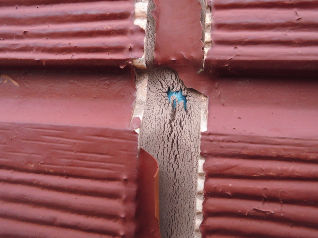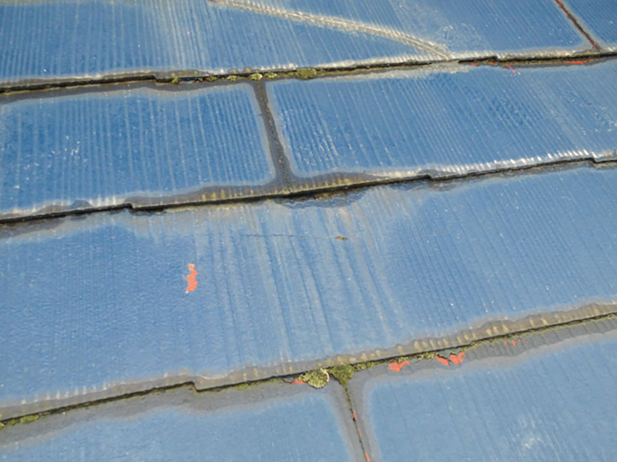 コロニアル瓦の色あせ、シミ、部分的に塗料の剥がれが見られます。