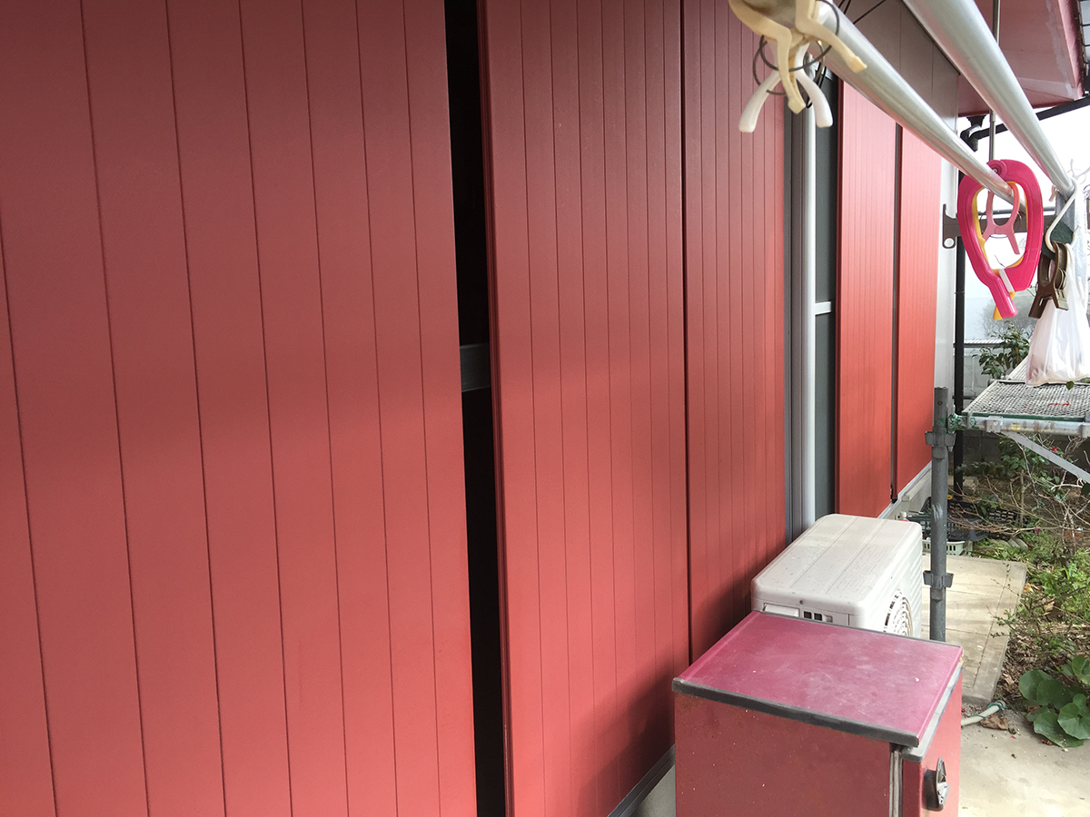 雨戸の赤い部分は下塗りのサビ止め です。じっくり丁寧に塗らないと、 いくら良い塗料を使っても宝の持ち腐れです。