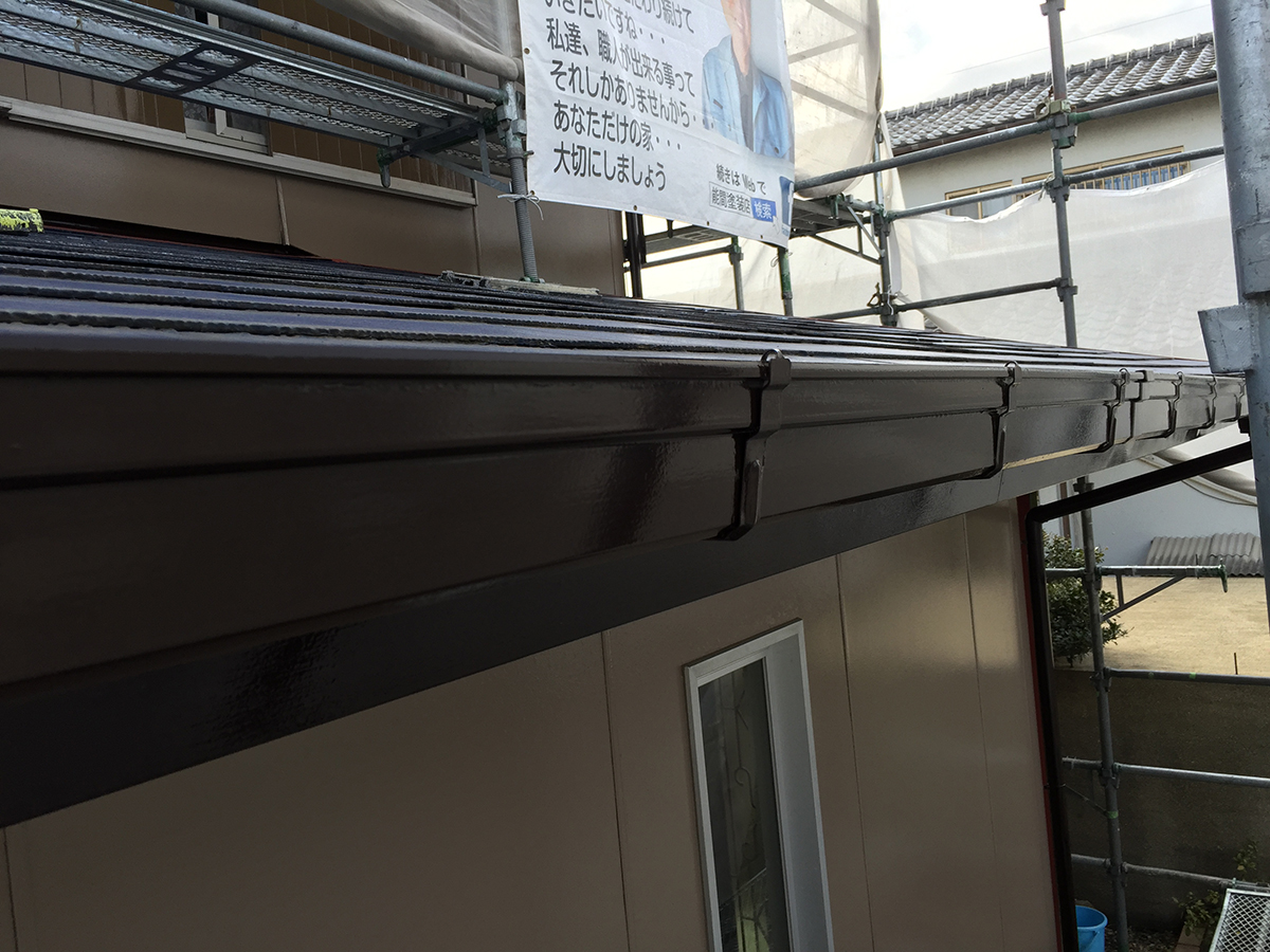 雨樋・破風板も塗装が終了。日本ペイン卜の弱溶剤2液形4フッ素を使用。フッ素の耐久性を更に高めた優れものです。