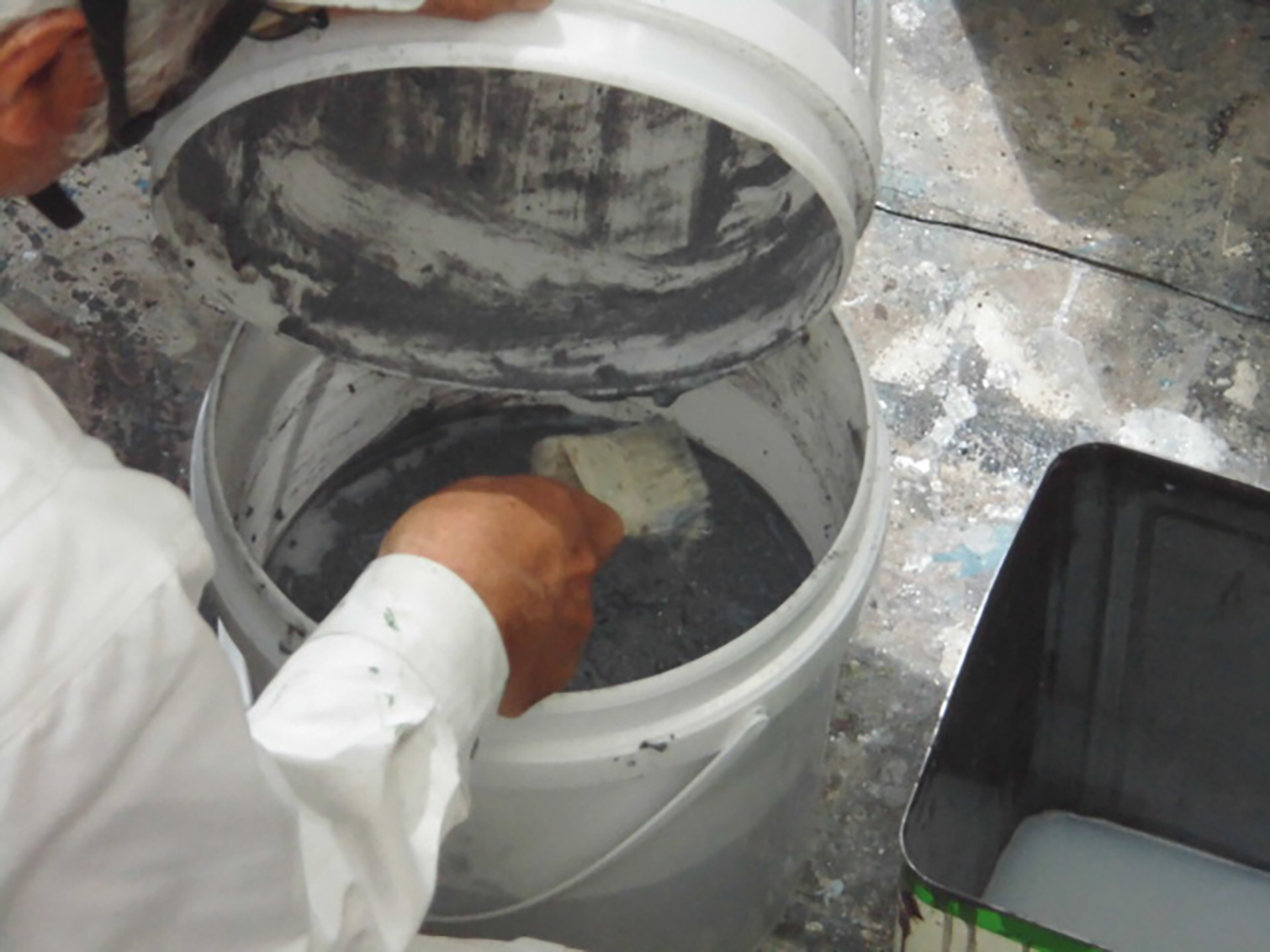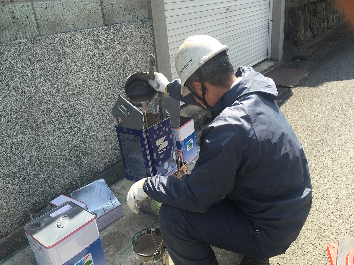 主剤と硬化育を調合しています。正しい知識と方法(温度・分量〉が求められます。水性塗料と違うプロの技術が求められます。