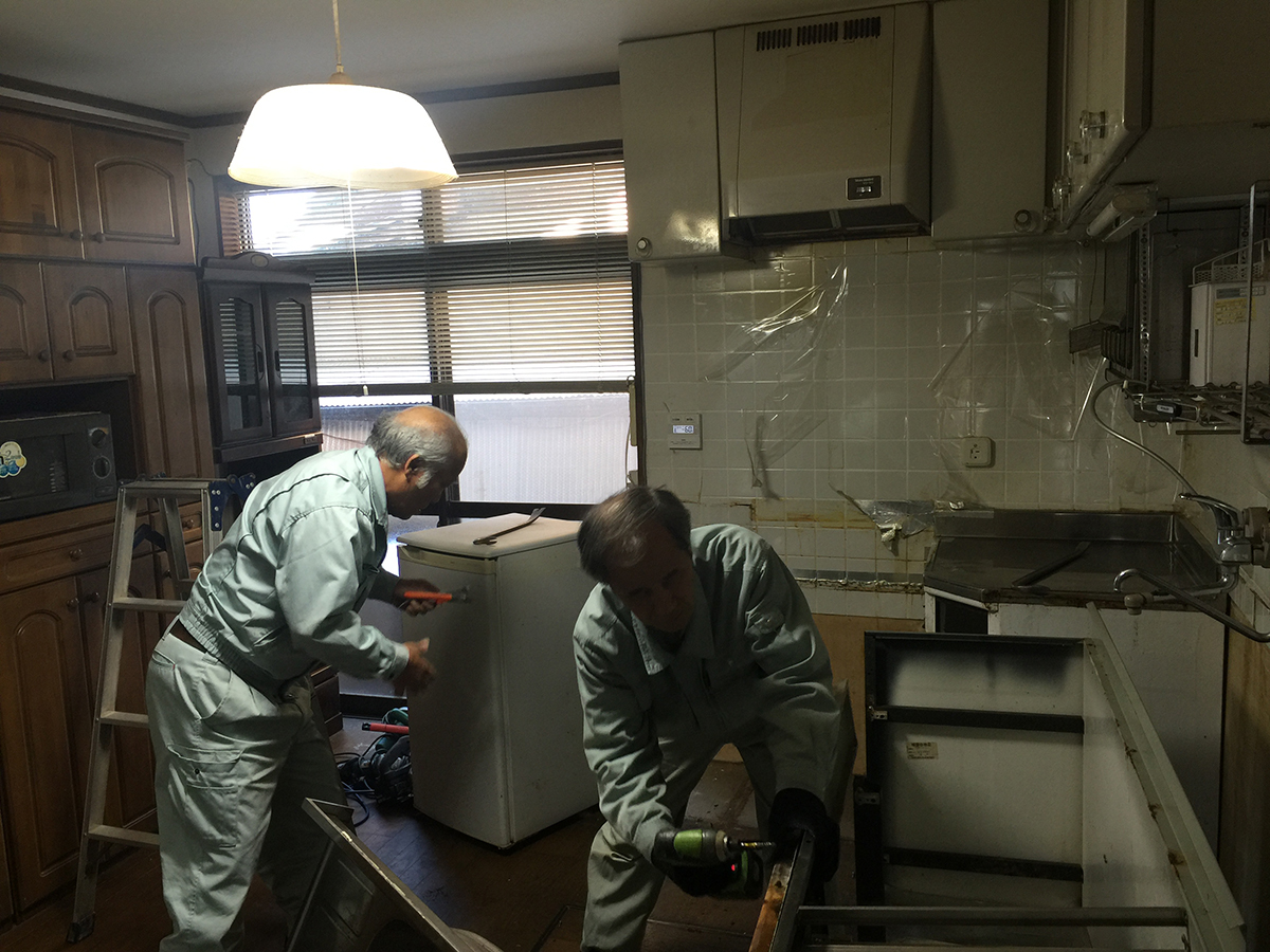 古いキッチンの解体写真です。床もペット対応のフロアに貼り換えます。