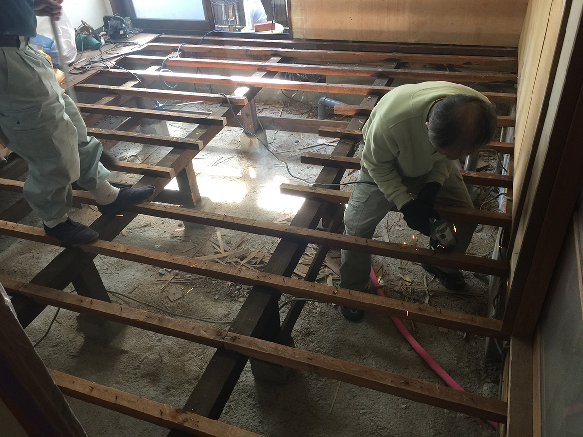 床を全て剥ぎ取りました。床下の点検後、木材の細かい補修は全て行います。