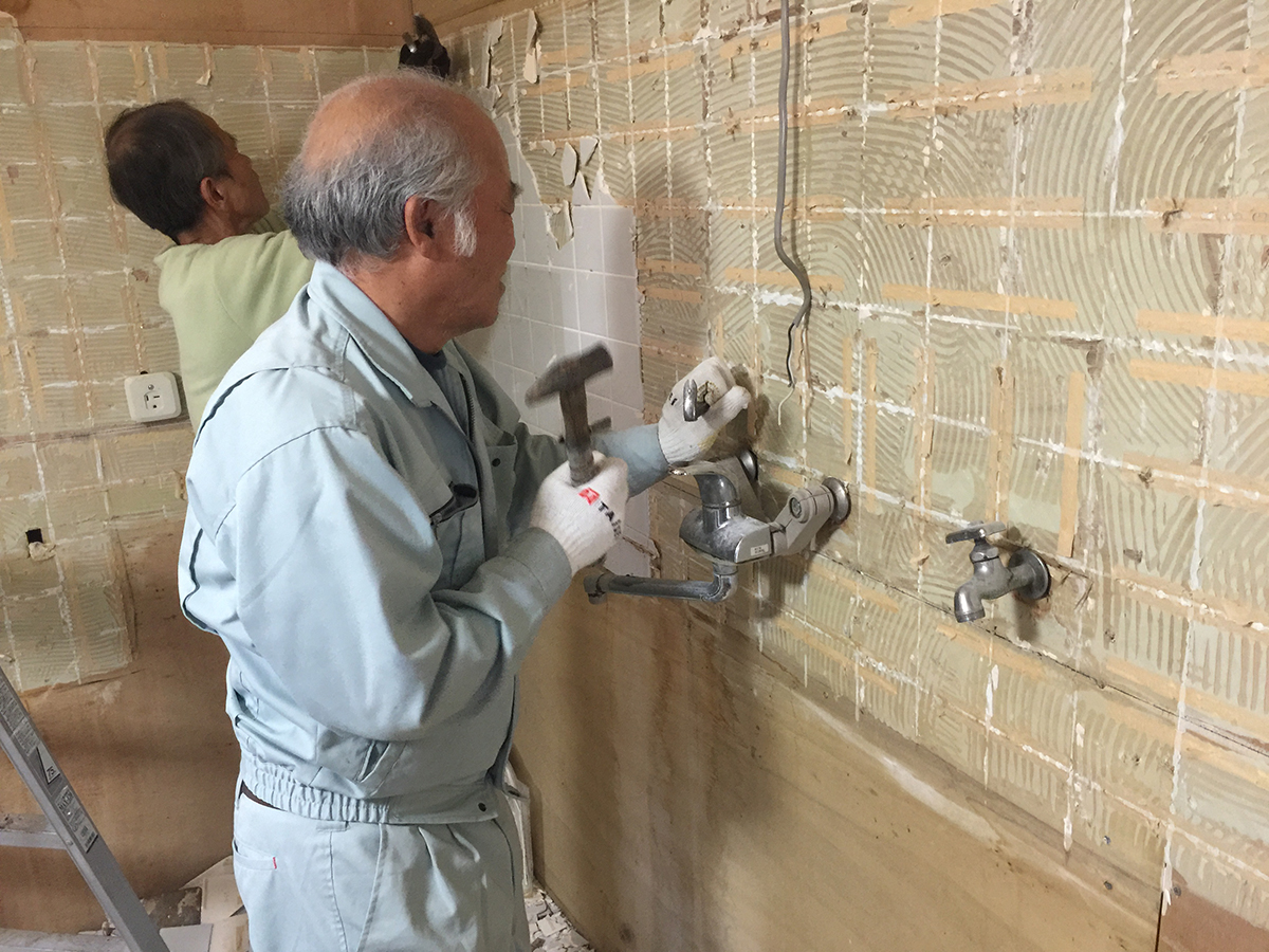 壁のタイルは丁寧に剥がします。下地処理後、下地ボードを貼り、その後に不燃材のキッチンパネルを貼り付けます。