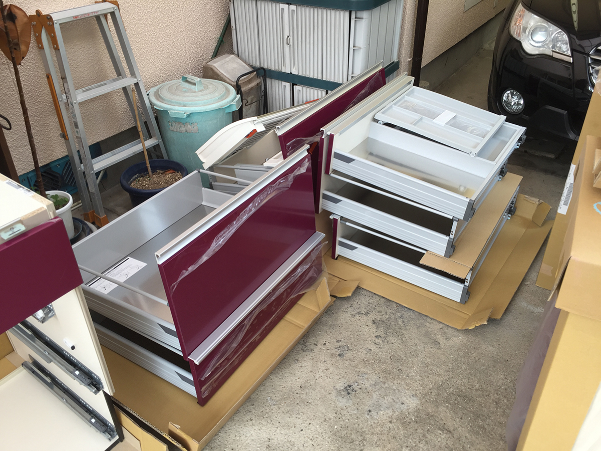 Lixilのシステムキッチンが納入されました。ここから組立が始まります。高級グレードにしかない色合いです。
