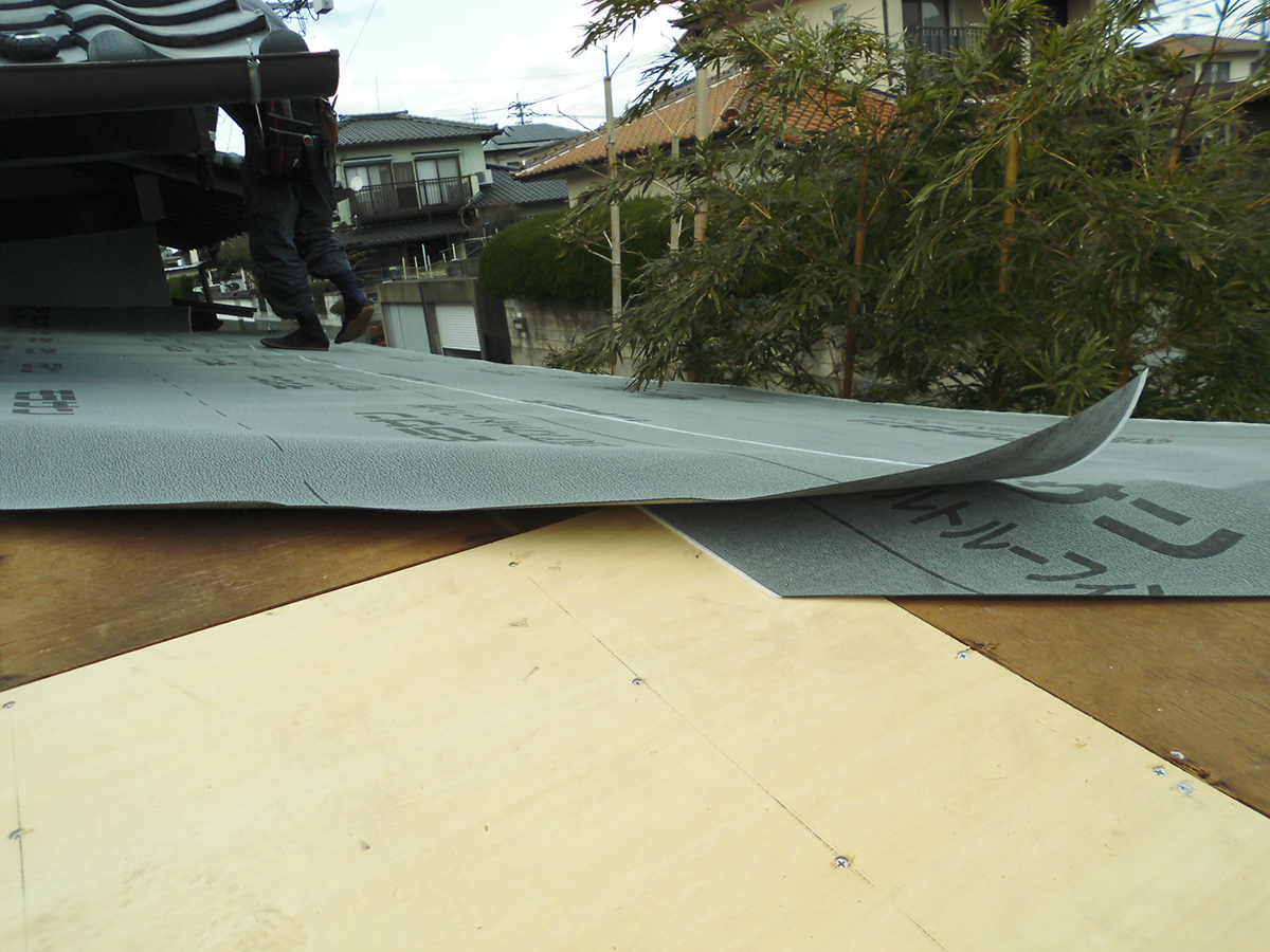 雨漏れしていた箇所の木材は交換します。その上にゴムアスファルト防水紙を張ります。