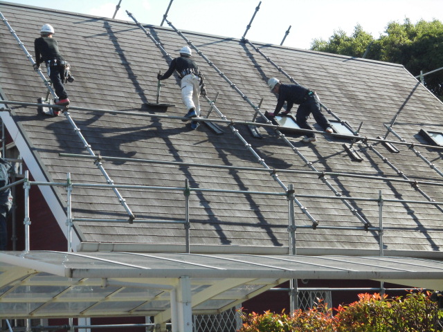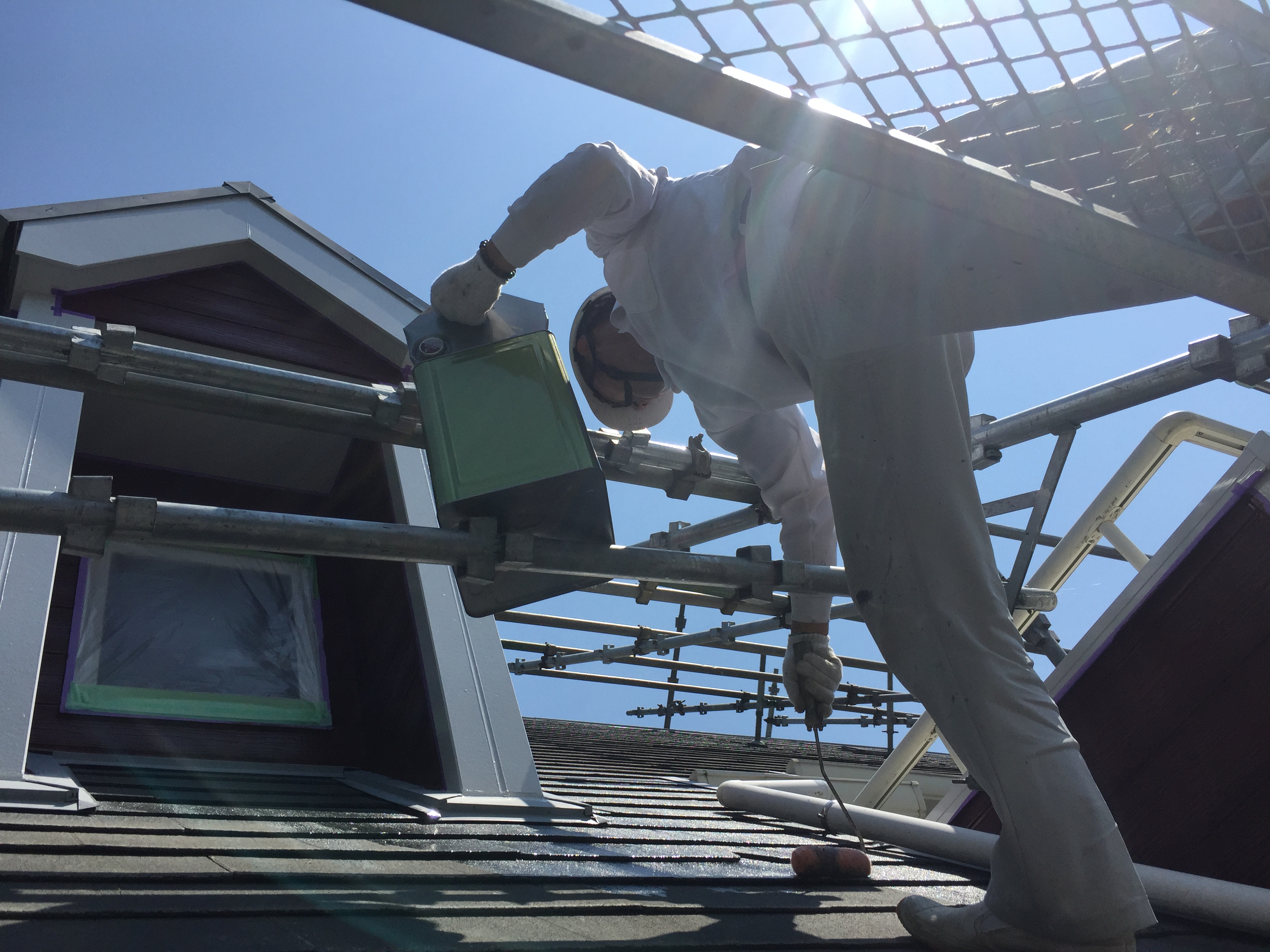 大屋根の角度(勾配)が急なので、屋根にも足場が無いと塗装出来ません。