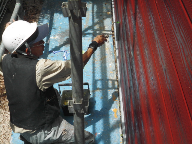 外壁を含め今回の塗装は全て弱溶剤2液形フッ素です。超耐候性があり壁に付着した汚れを雨水で落とす機能があります。