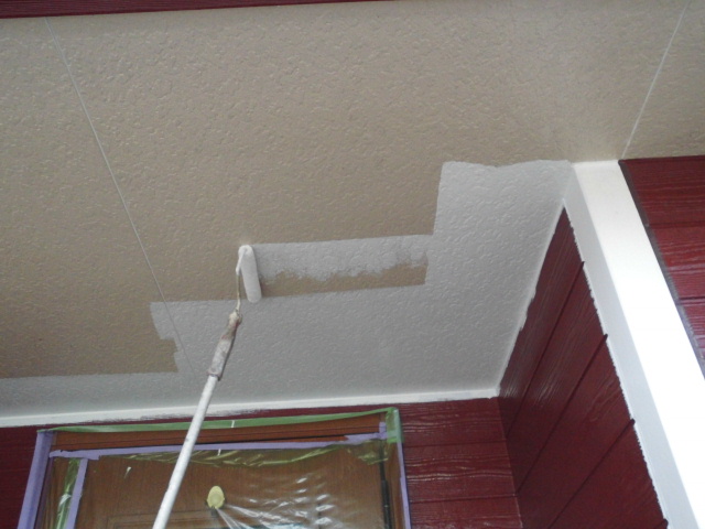 今回の目玉、15年超耐久水性プレミアムシリ コンの塗り始め。下塗りの後、丁寧にローラー で2回塗り。爽やかなブルーが少し入ってます。